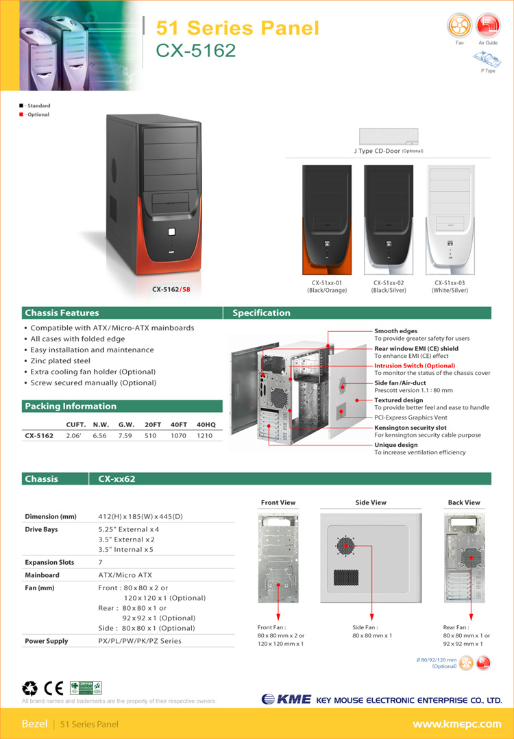 1.Sharp and Elegant outlook finished w/ customized coloring 2.Big volume of Driver Bays for system expansion 3.Optional front-end access USB2.0/ Audio w/ 3.5” sliding cover door